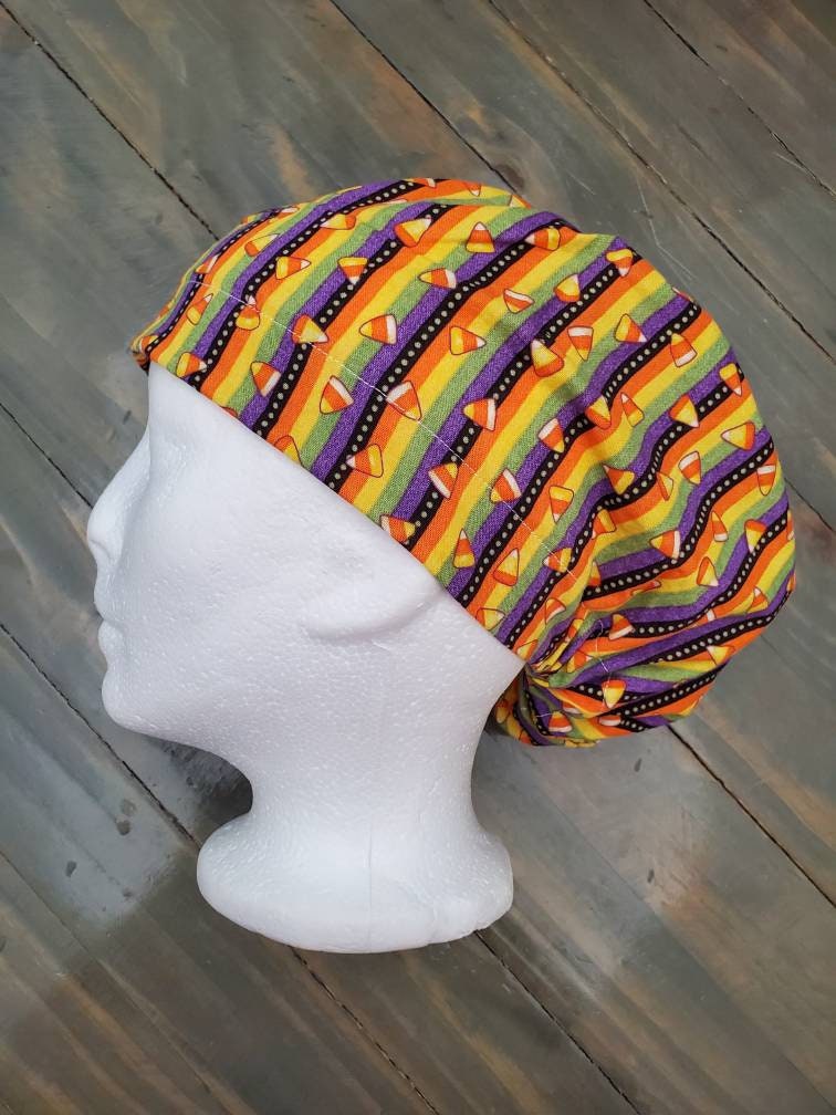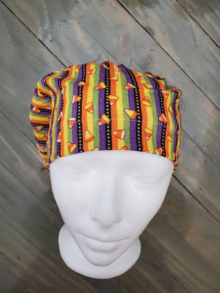 Candy corn stripes bouffant/Euro style surgical/scrub hat/cap. All fabric is prewashed and contains elastic in the back with an adjustable toggle. Very comfortable and fits those with short, medium or long hair.