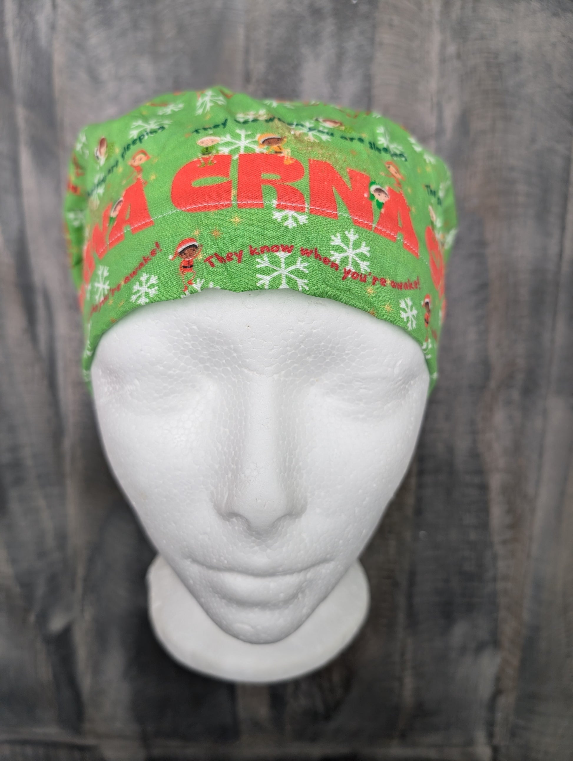 Prewashed cotton CRNA sleeping/ awake Christmas fabric sewn into a bouffant/euro hybrid style surgical hat.