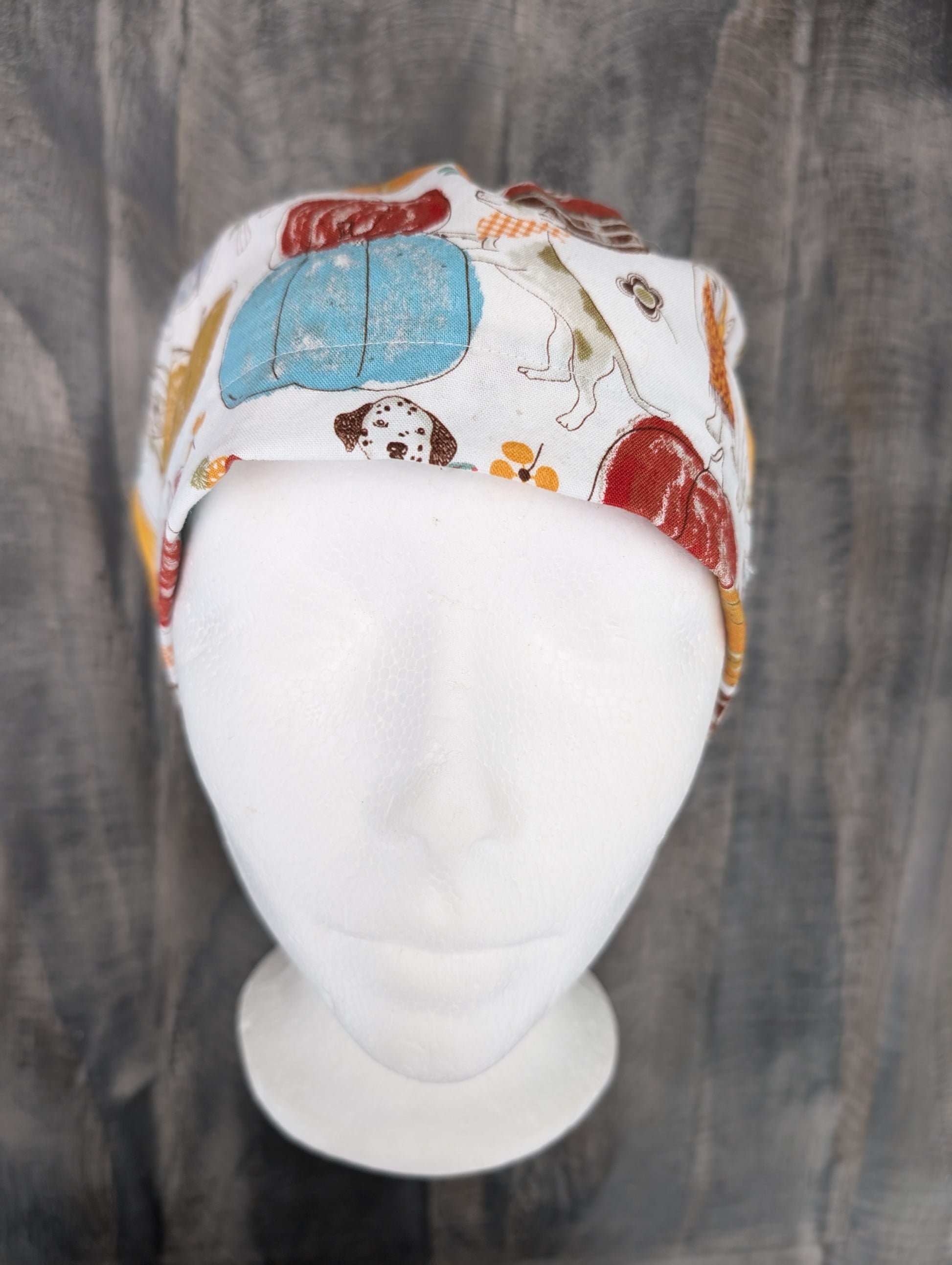 Dogs of fall bouffant/Euro hybrid style surgical/scrub hat/cap. Front part of hat is euro style with the roominess of a bouffant in the back.