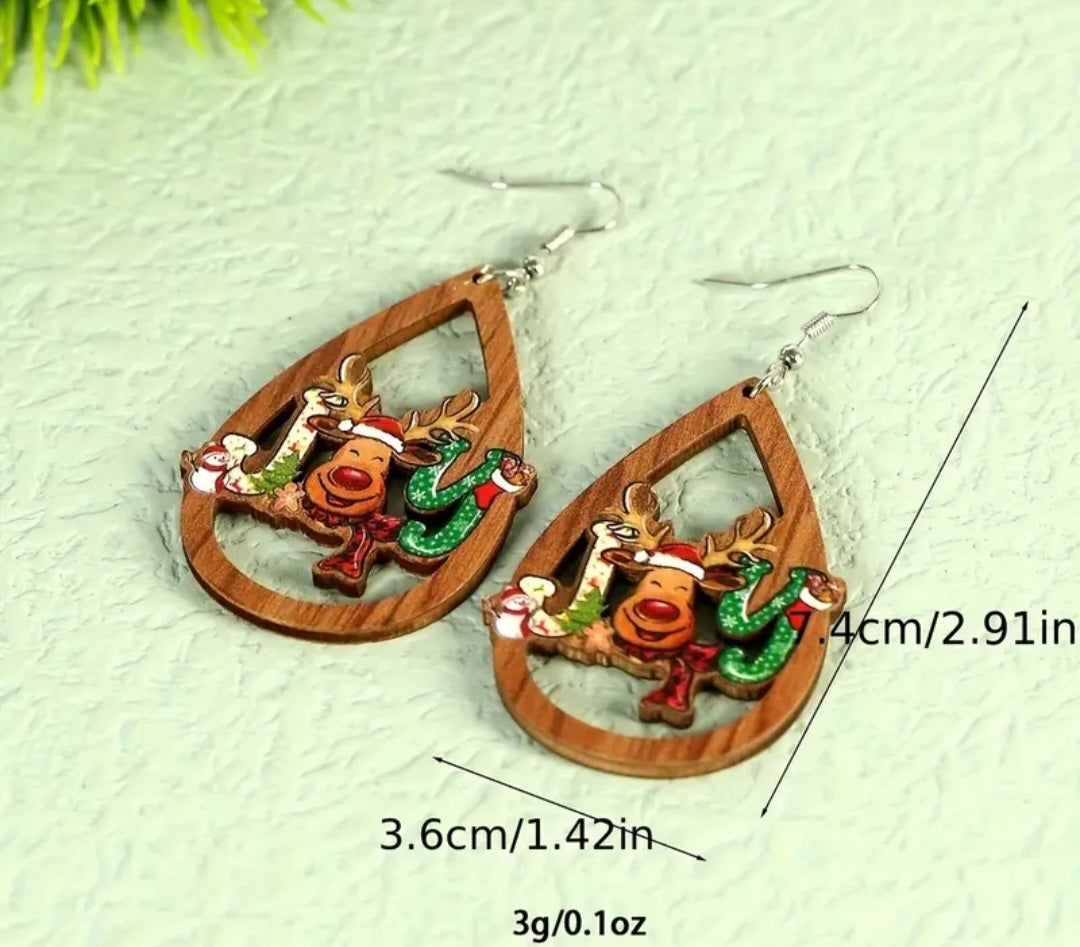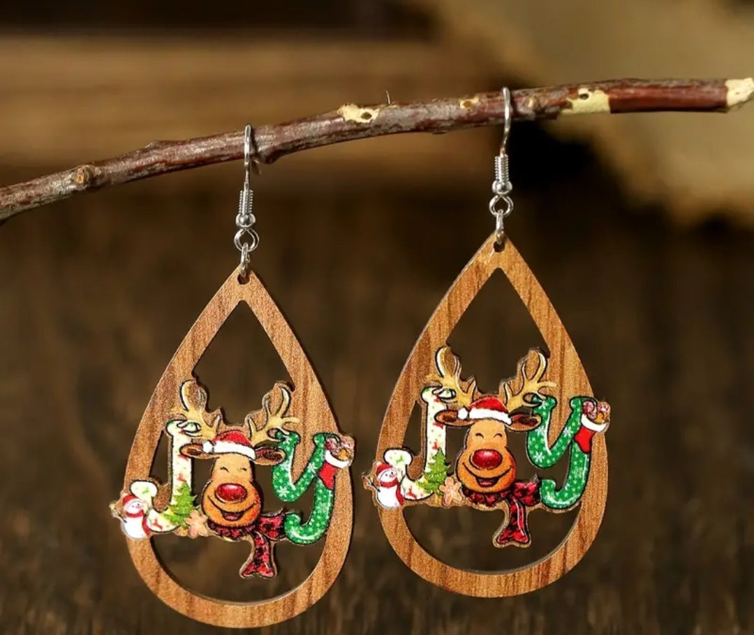 Hollow wooden droplet Joy elk earrings. Lightweight and adorable. Makes a perfect gift.