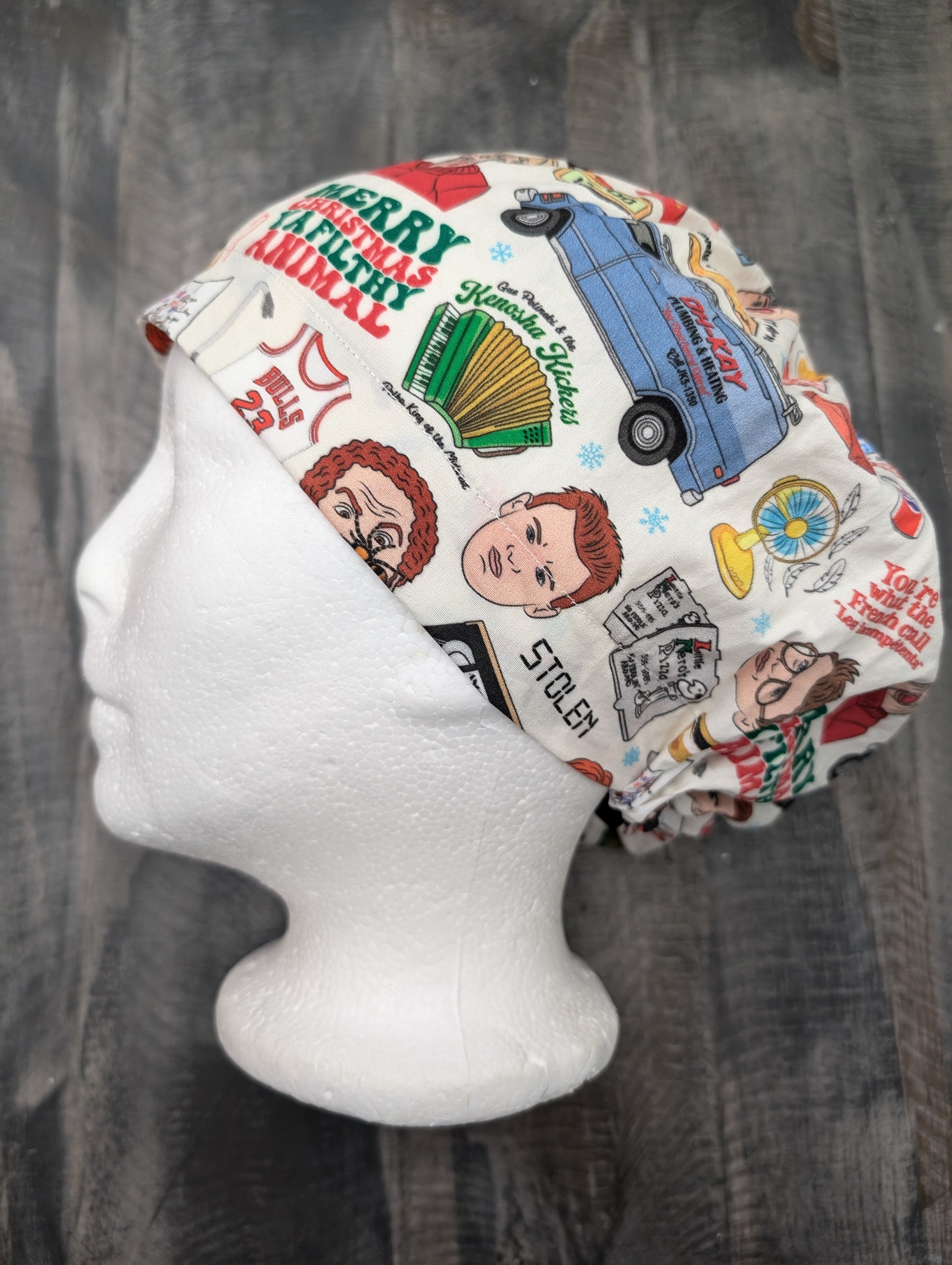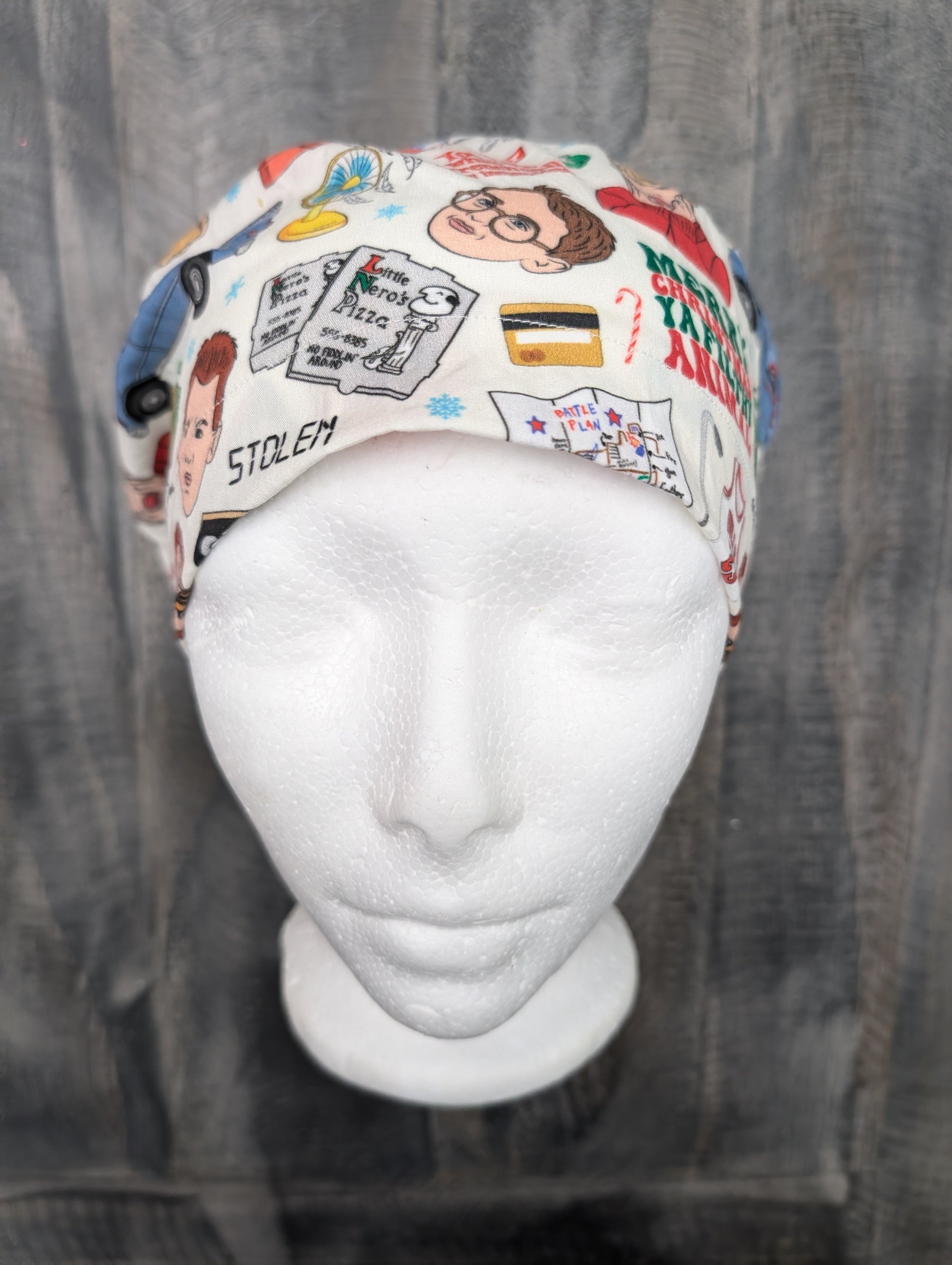 Prewashed cotton Home Alone fabric sewn into a bouffant/euro hybrid style surgical hat. Front part of hat is euro style with the roominess of a bouffant in the back.